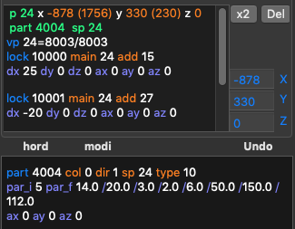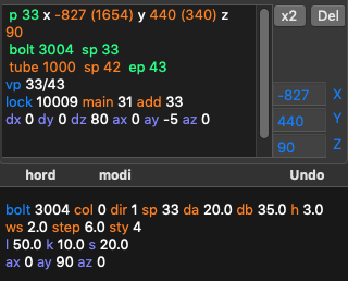 Describes a parent-child relationship between points. dx, dy, and dz are offsets of the child on the corresponding axes (in other words, coordinates of the child in a coordinate system where the origin is the parent's location instead of the global origin); ax, ay, and az are (relative to parent) rotations of the child around corresponding axes: